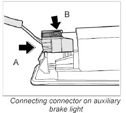 1. Push the connector onto the auxiliary brake light -Arrow A- until the locking lug -B- is felt to engage.