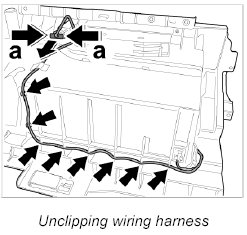 2. Remove wiring harness on the mounting points on the glove compartment -Arrows-.