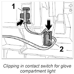 1. Press the door switch for the glove compartment light -1- and the connector socket -2- in the mounting points, until they can be felt to engage.