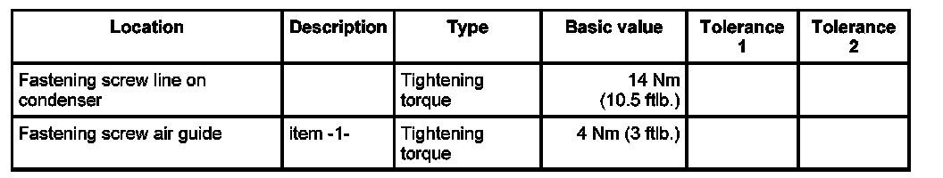 3. Engage air guide on condenser -A- and screw down using the two fastening screws -1-. - Tightening torque: 4 Nm (3 ftlb.)