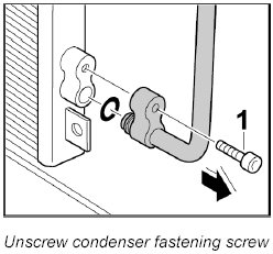 4. Unscrew the fastening screws -1- of the line condenser-condenser and pull the line out of both condensers.