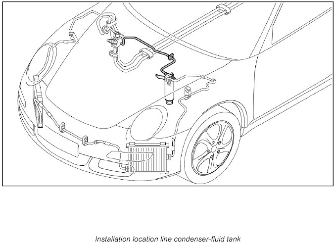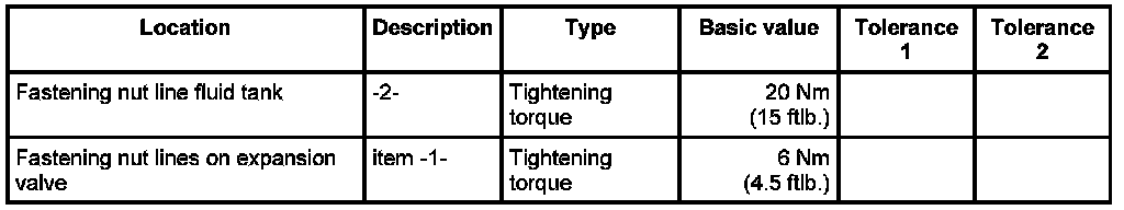 1. Lay the refrigerant line under the heat exchanger hoses and screw down on line to fluid tank -2- with fastening nut. - Tightening torque: 20 Nm (15 ftlb.)