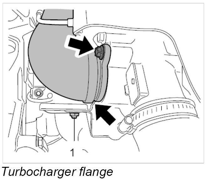 2. Unscrew two Torx screws (M6 x 20) -Arrows- on the turbocharger.