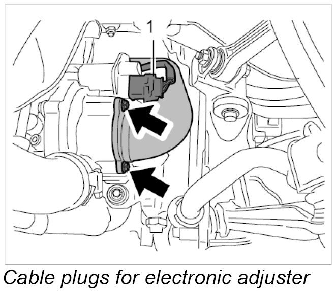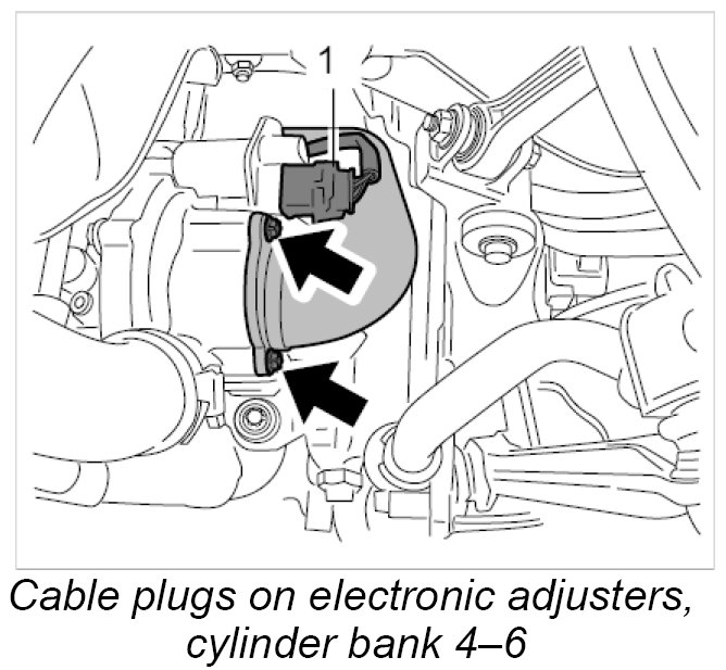 9. Connect cable plugs -1- to the electronic adjusters and lock them. The cable plugs must engage audibly. Pull on the plugs to check that they are seated securely.