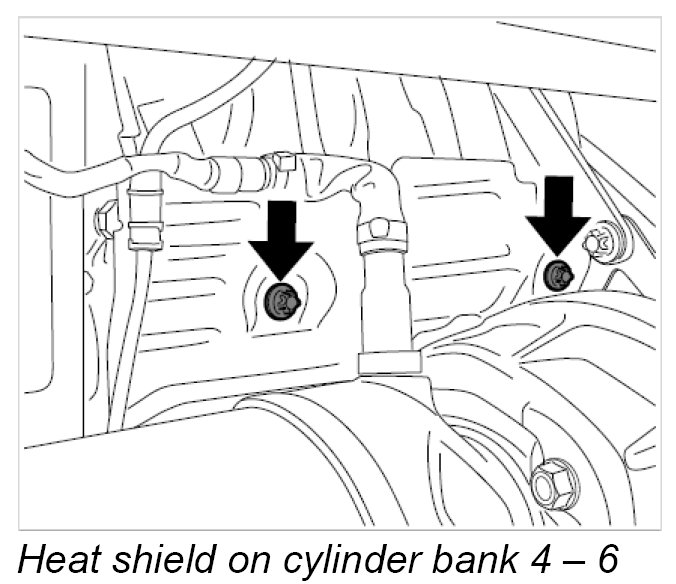 5. Insert the heat shields again and fasten them in place using two Torx screws (M6 x 12) -arrows- on each one. tightening torque: 10 Nm (7.5 ftlb.)