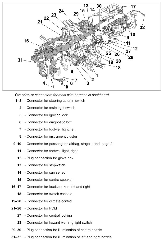 14. Connect plug connections between main wire harness and wire harness for heater/air-conditioning unit -79 and 80-.