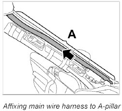 9. Remove protective film of adhesive strip on main wire harness -area A- and affix main wire harness to A-pillar.