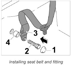 3.1. Tighten fastening screw -2-, seat belt with fitting -3- and spacer sleeve -4- on inner lower side member. - Tightening torque: 50 Nm (37 ftlb.)