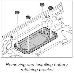 5. Position battery retaining bracket and secure with the four fastening nuts. - Tightening torque: 10 Nm (7.5 ftlb.)