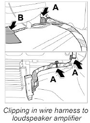 26. Clip in wire harness to loudspeaker amplifier -Arrows A- and fix with new adhesive tape -Arrow B-.