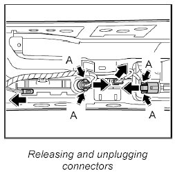 1. Release electric connectors for the equipment versions (e.g. cigarette lighter, interior sensor etc. -A- and unplug.