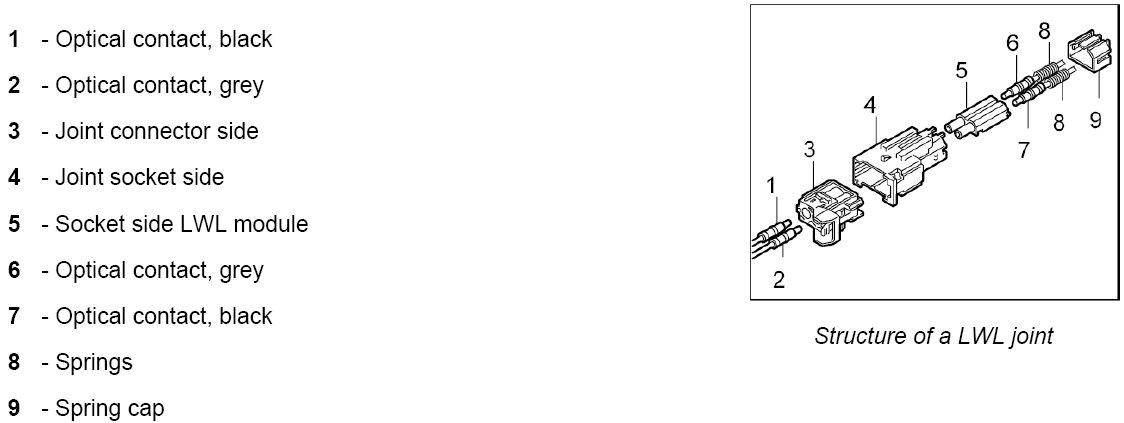 The LWL is delivered with affixed plastic contacts. These contacts are latched in the connector housing in the case of repairs. Grey and black contacts with identical mechanical dimensions are used.
