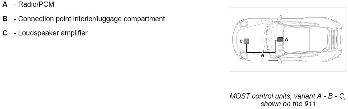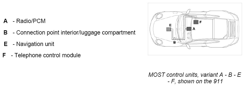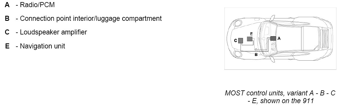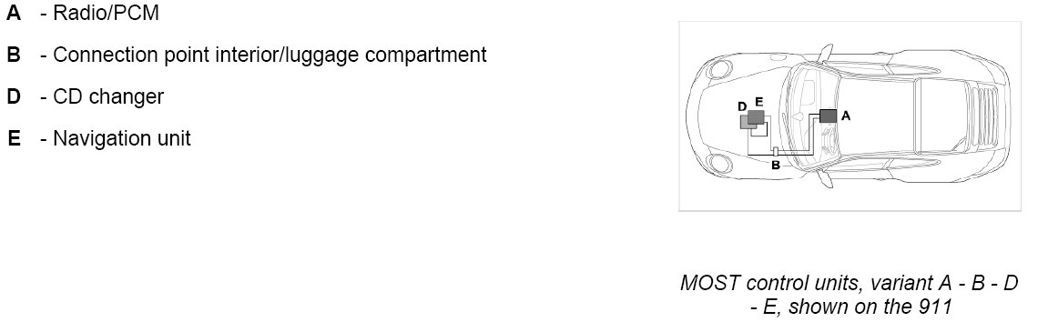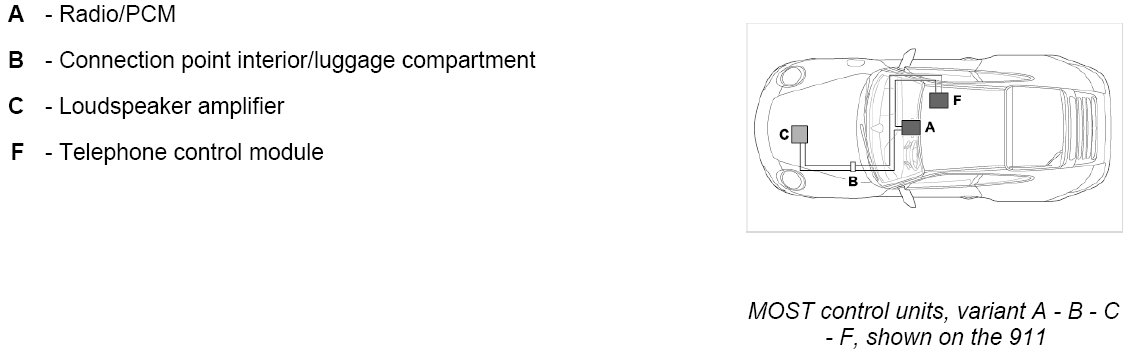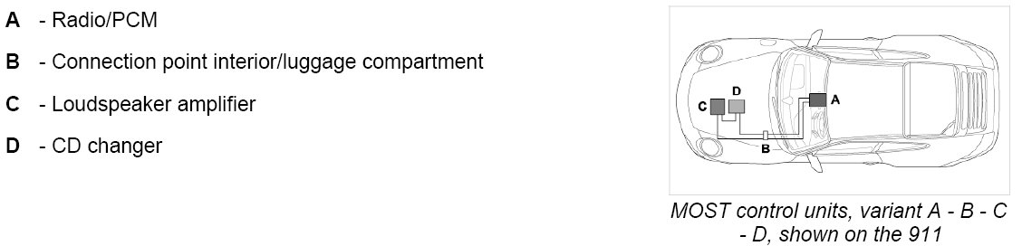The graphic clarifies the cabling of the individual MOST control units which vary according to their equipment.