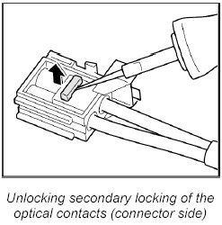 3. Position the press-out and unlocking tools for flat-type and round plug connectors of all sizes NR.155 for releasing the contact locking mechanism of the optical waveguide module and lift up the locking mechanism.