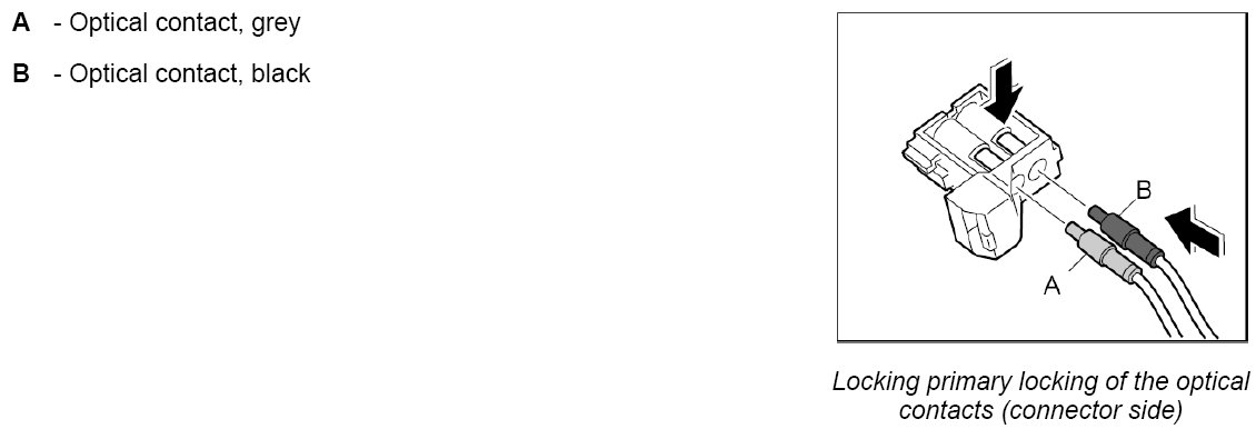 The LWL and the plug connections must not come into contact with fluids such as water, creeping compound, preservative, anti-freeze protection, cleaning agent. They will impair the MOST system function or cause complete system failure. Even plug connectors with plugged-in protective caps must not come into contact with the fluids listed.