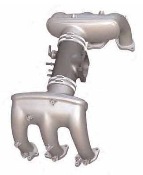 Both the intake pipes from the air cleaner to the turbocharger and the pressure pipes from the turbocharger to the throttle were modified with respect to their flow properties and the flow resistances reduced. The intake distributor is still made of plastic and is now produced in one piece. Compared with the intake distributor of the 911 Turbo (996) with a separate intake pipe support made of aluminium, the one-piece design offers weight advantages and improved flow transitions to the cylinder head. In addition, the dimensioning of the intake distributors was adapted to the new turbocharger concept. The intake distributor of the new 911 Turbo has a silver paint finish to improve the engine compartment design. A weight saving of approx. 4.4 lbs. (2 kg) was achieved for the intake system compared with the 911 Turbo (996).
