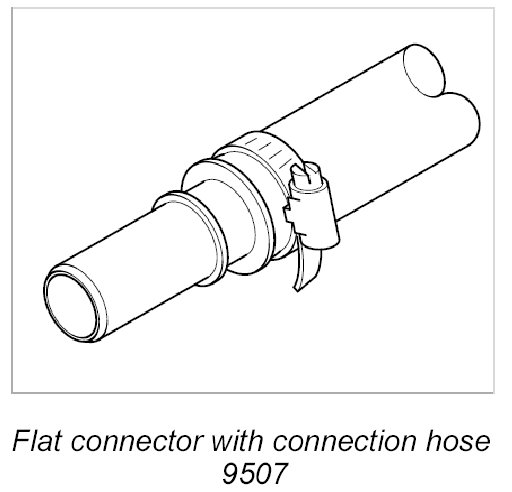 3. Insert the flat connector (Original Porsche spare part with Part No. 996.106.255.00) with the O-ring side into the open end of the hose for the special tool connection hose 9507 and secure with a screw-type clamp.