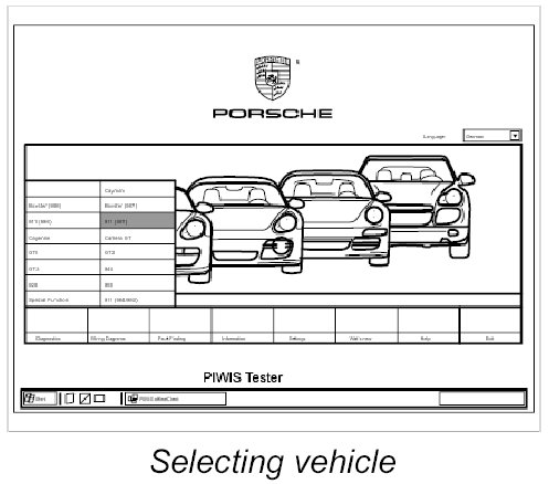 5. Switch on the Porsche PIWIS Tester 9718, select Diagnosis and then highlight the vehicle 911 (997).