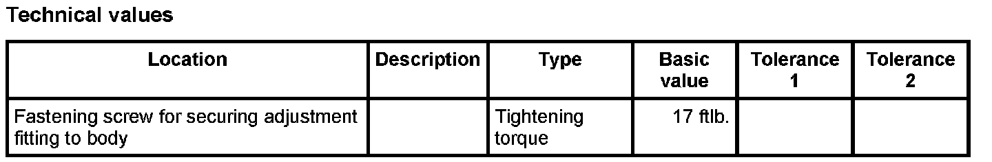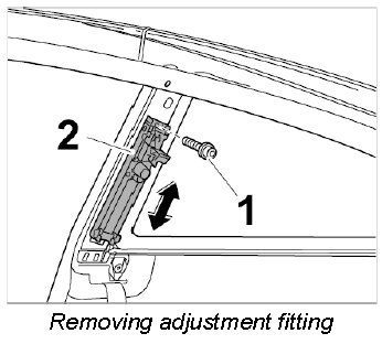 1. Run adjustment fitting -2- down into the B-pillar -direction of arrow- and tighten the fastening screw -1-. Tightening torque: 17 ftlb.