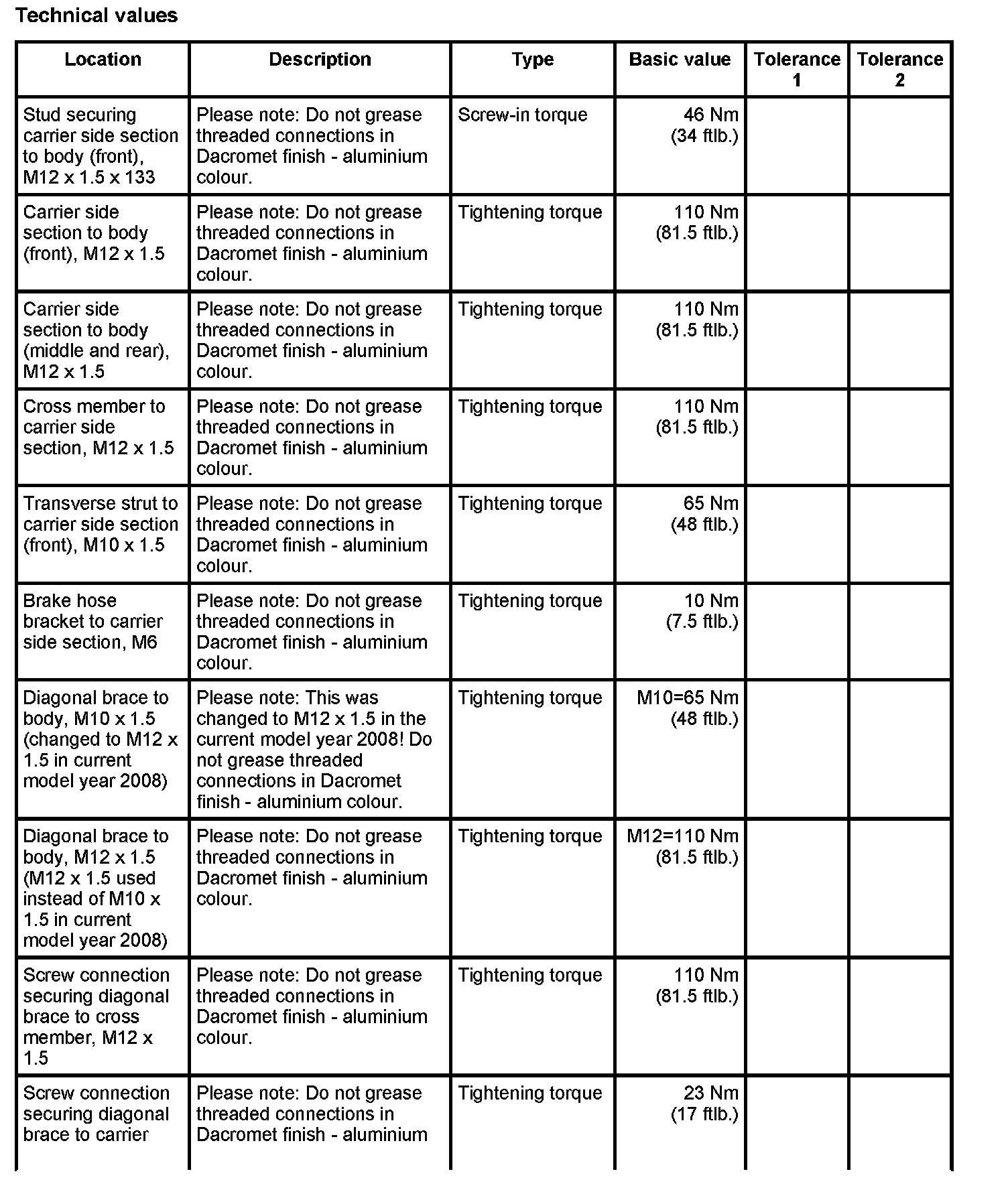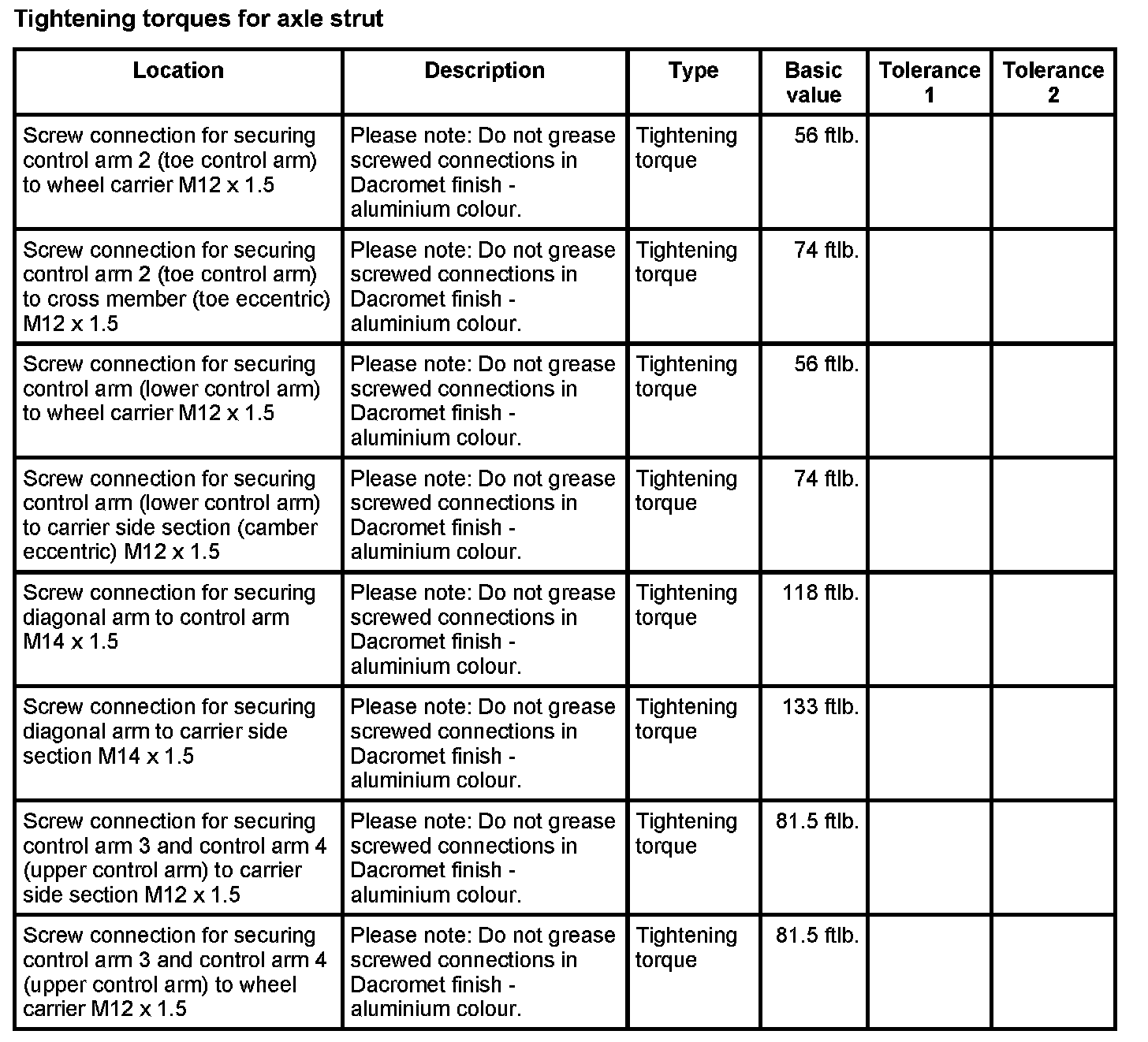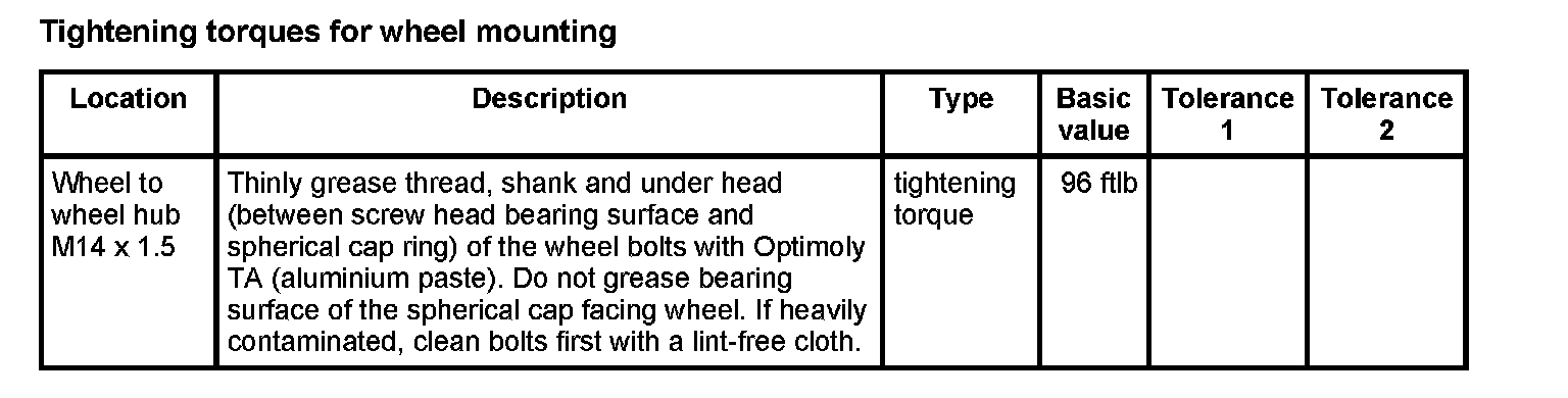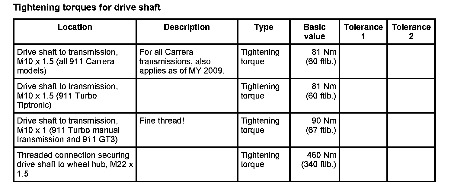 Tightening torques for rear axle