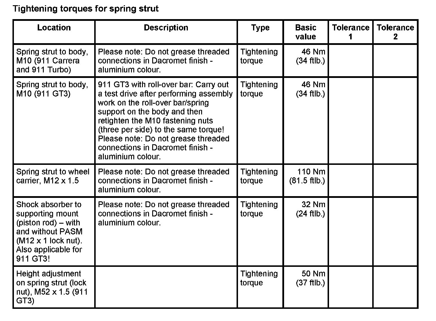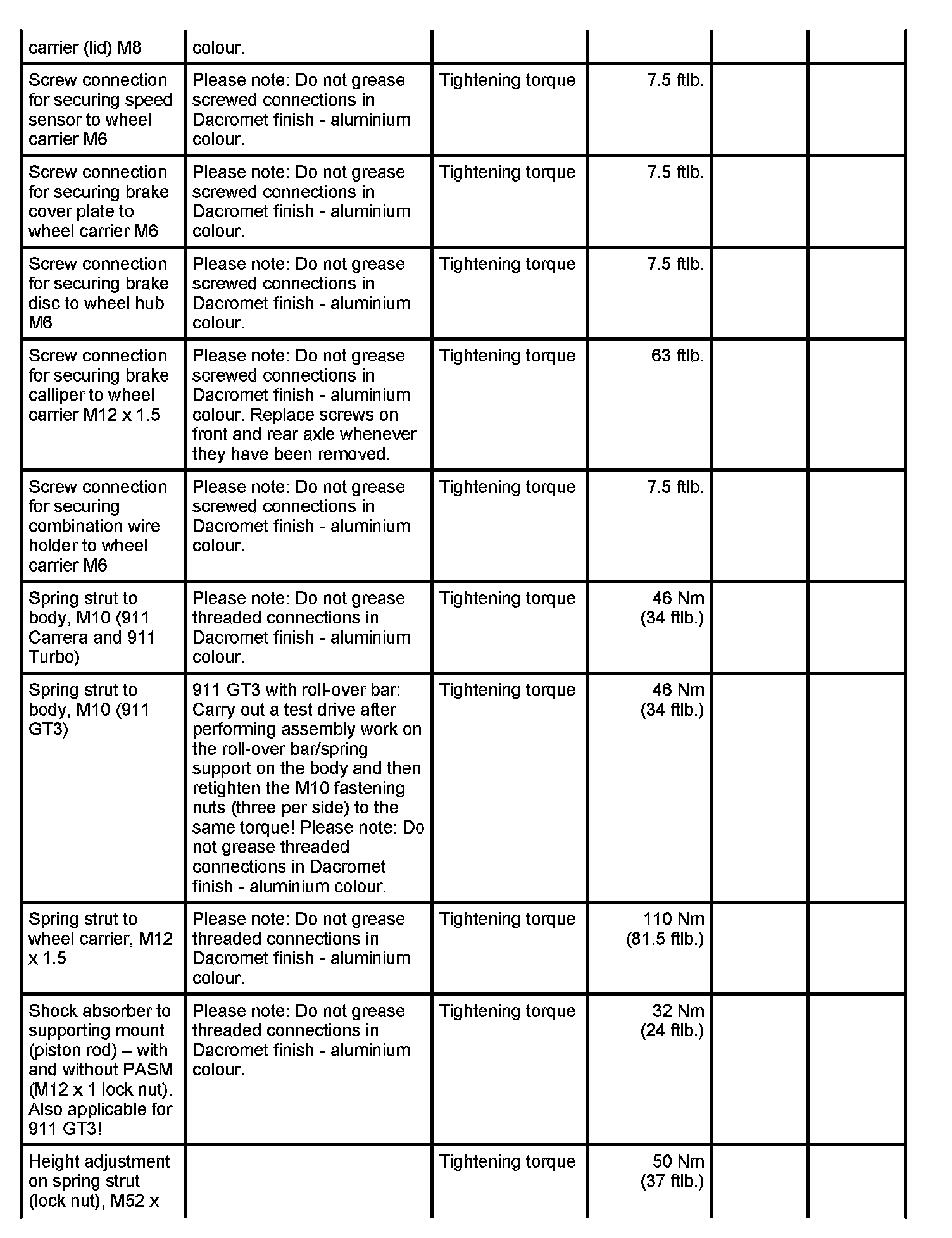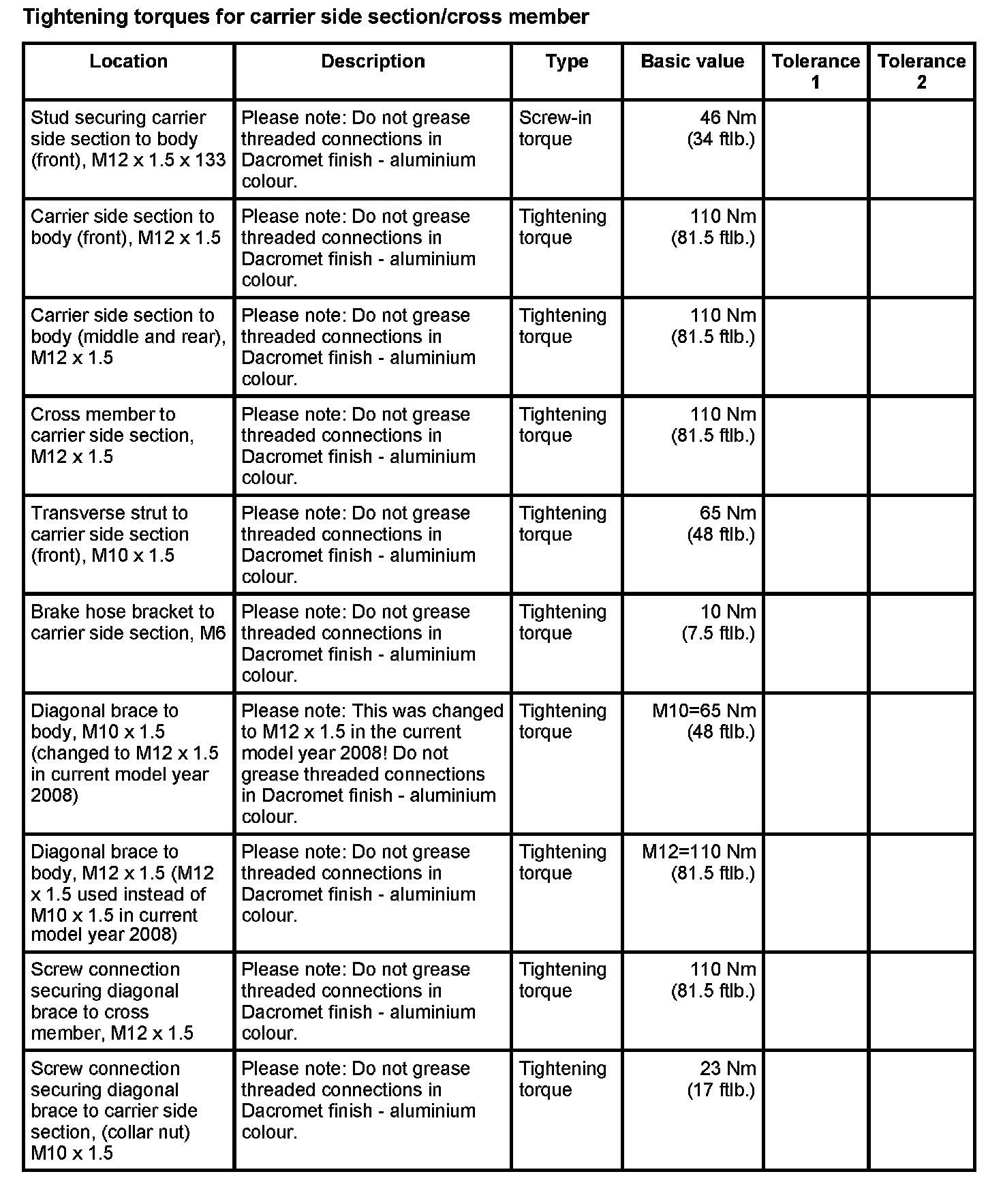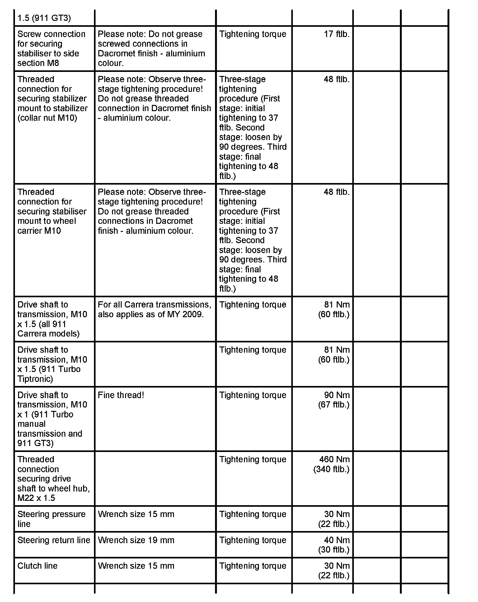 Tightening torques for rear axle