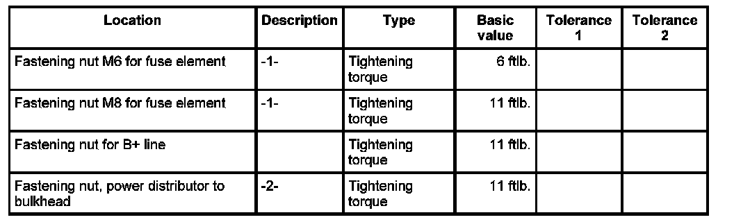 1. Position the fuse elements -3- in the power distributor in accordance with the wiring diagram and position the marked connection leads in turn, fit the washer -2- and tighten with the fastening nuts -1-. - Tightening torque: 6 ftlb. - Tightening torque: 11 ftlb.