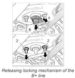 2. Release the locking mechanism of the B+ line -A- and pull off the B+ connection from the power distributor -B-.