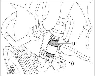 7. Fit (screw together) plug-in coupling for pressure line (short pressure line to power-steering pump).