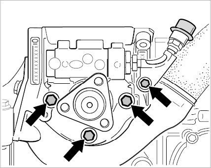 1. Fit the pulley on the hydraulic pump (three screws/tightening torque: 23 Nm (17 ftlb.)).