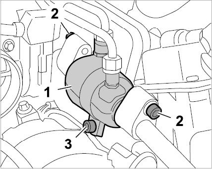 3. Position fuel cooler -1- and tighten the screw -3- on the holding clamp.