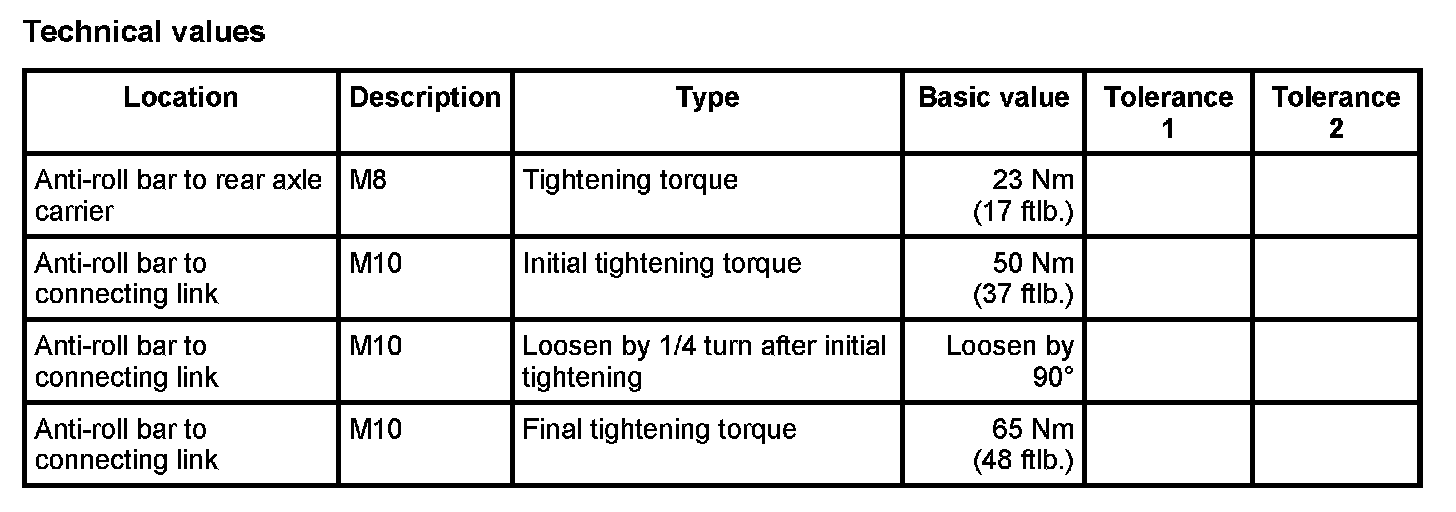 Always tighten the connecting links (suspension/stabilizers) in three steps (Step 1: tighten to 50 Nm (37 ftlb.). Step 2: loosen by 90 degrees. Step 3: tighten to 65 Nm (48 ftlb.))!
