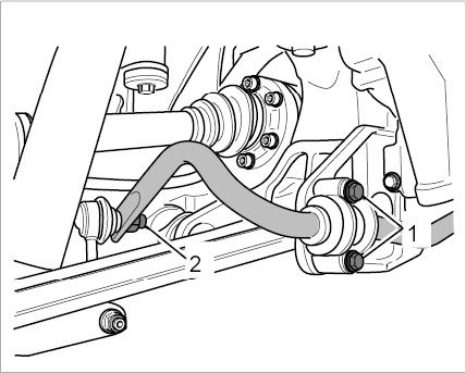 1.1. Engage anti-roll bar on the connecting links (suspension/stabilizer) -2- and then secure on the rear axle carrier using two hexagon-head bolts -1- on each. -> Tightening torque: 23 Nm (17 ftlb.)