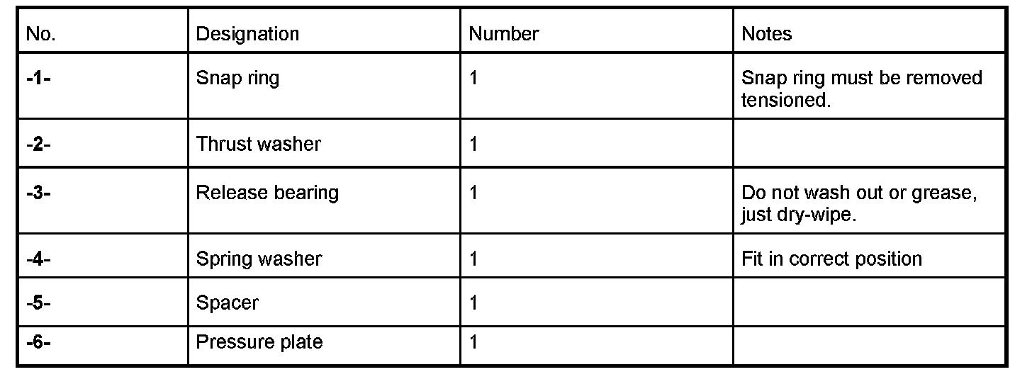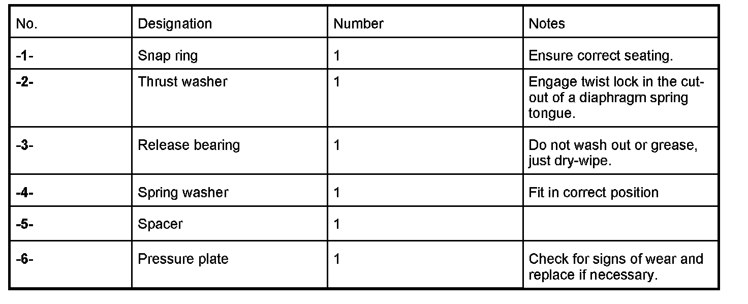 1. Position the release bearing -3- and press down on the pressure plate -6- using a suitable pressure piece (e.g. block of hardwood) until the snap ring -1- can move freely.