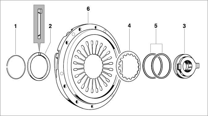 3. Position release bearing and press down on the pressure plate -6- using a suitable pressure piece (e.g. block of hardwood) and press until the snap ring -1- can be fitted.