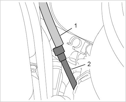 3. Slide the protective sleeve of the parking-brake cable -2- on the underbody onto the guide tube -1-. Ensure it is seated correctly!