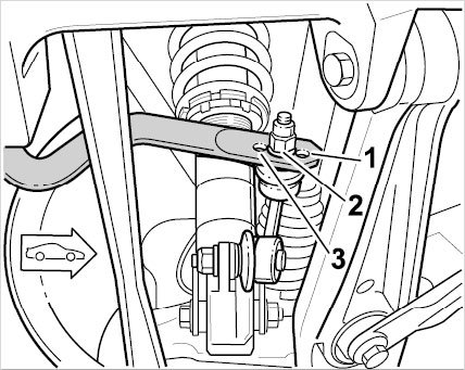 ^ Observe correct tightening torques. Tighten the connecting link for the anti-roll bar in three steps (step 1: tighten to 50 Nm (37 ftlb.)/step 2: loosen by 90°/step 3: tighten to 65 Nm (48 ftlb.)).
