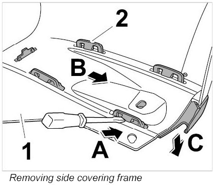 1. Carefully press in the lugs of the covering frame at the side -2- with a screwdriver -arrow A-. First remove the covering frame -2- downwards -direction of arrow B-. Afterwards pull rearward -direction of arrow C- out of the front end -1-.