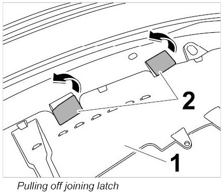 1. Pull joining latch -2- out of the front apron -1- ( -arrows- ).