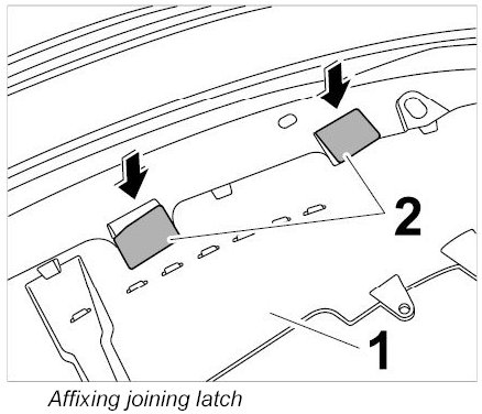 1. Position joining latch -2- on the front apron -1- and stick it on -arrows-.
