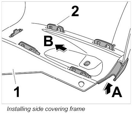 1. Insert frame laterally -2- upwards into -direction of arrow A- the front apron -1- and lock -direction of arrow B-.