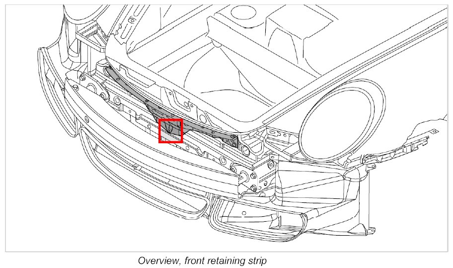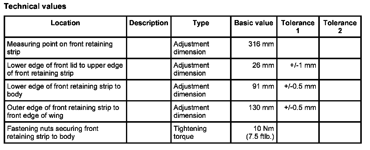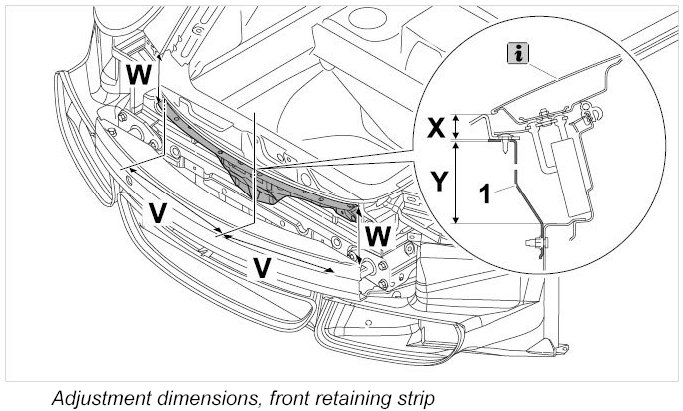 - In order to reduce adjustment work to a minimum when assembling the front spoiler, the front retaining strip must be aligned with the lower edge of the lid according to the dimensions shown.