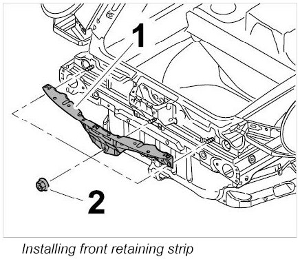 1. Position front retaining strip -1- on the body and tighten down slightly with the fastening nuts -2-.