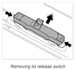 1. Press fastening ribs of scuff plate -arrows- outward with a small screwdriver and unclip switch for lid release.