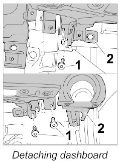 1. Unscrew fastening screws -1- from dashboard -2- at the lower front passenger side.