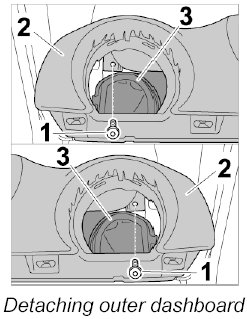 3. Unscrew fastening screws -1- near instrument cluster and centre air guides -3- from dashboard -2-.