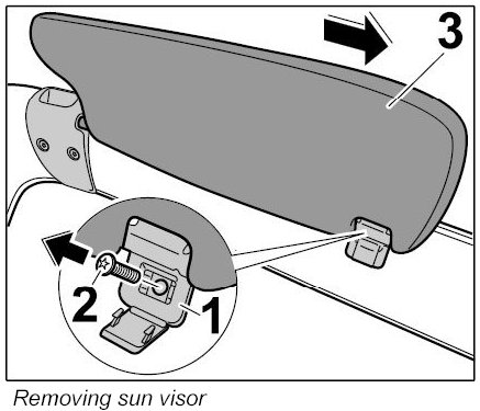 2. Pull off the sun visor -3- from the mounting saddle towards the centre of the car.