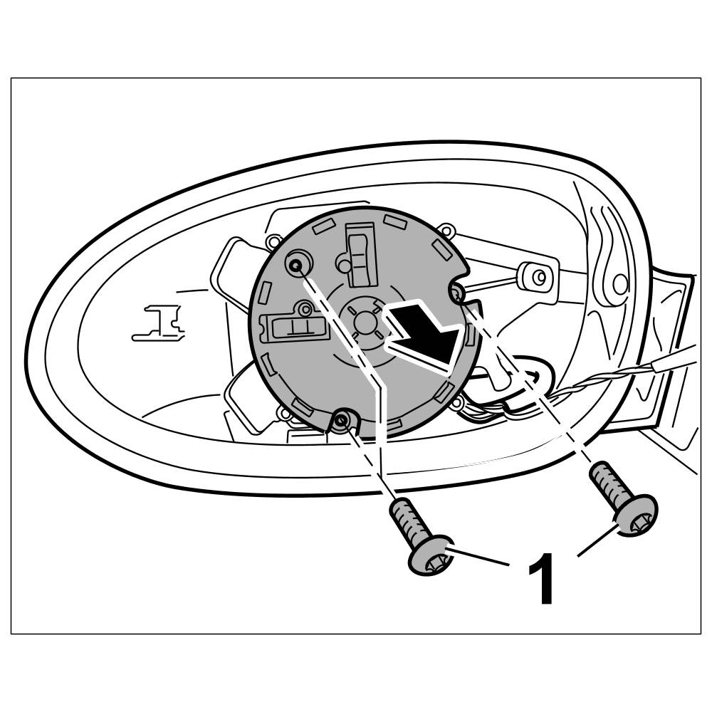 2. Unscrew the three fastening screws -1- from mirror adjusting motor.
