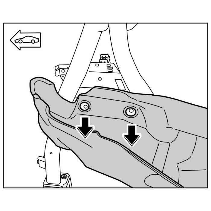 3. Press water drip pan onto the two strips of double-sided adhesive tape close to the hood support fastening point -arrows-.