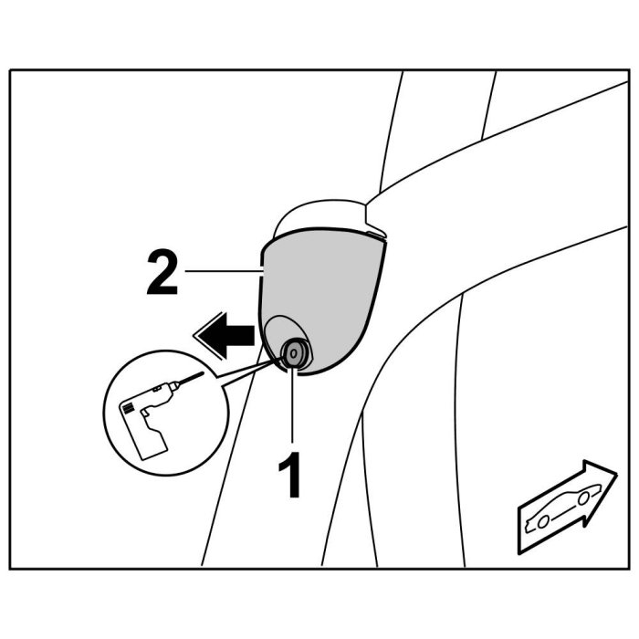 1. Drill out the blind rivet -1- on the trim -2- using a 5-mm drill bit. Remove the trim -arrow-.