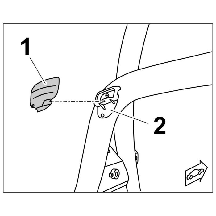 3. Fit trim -1- on the lower part of the rubber stop -2- ( -arrow- ) until the latches engage securely.